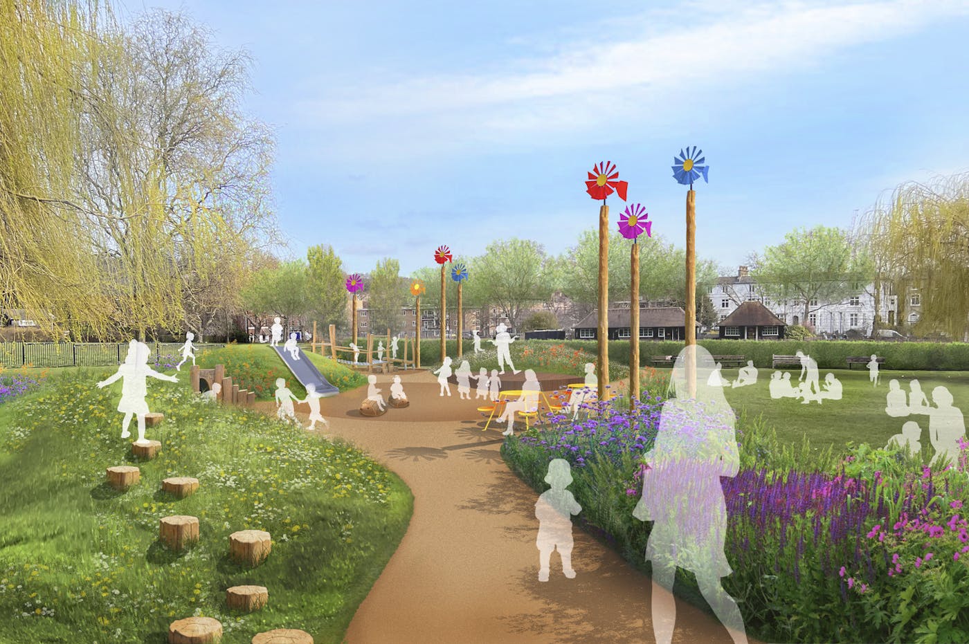 Our designs include regenerating the existing toddlers' garden, playground and paddling pool to provide plenty of physical and social play value, not only from the new equipment but also from their landscape setting. We also proposed a new half MUGA (Multi Use Games Area) to revitalise a redundant spot, and a new wetland area, which introduces a new habitat and sustainably manages stormwater runoff from the famous Parliament Hill viewpoint. The wetland area also immerses users in nature with the addition of a boardwalk and incidental ‘play on the way’.