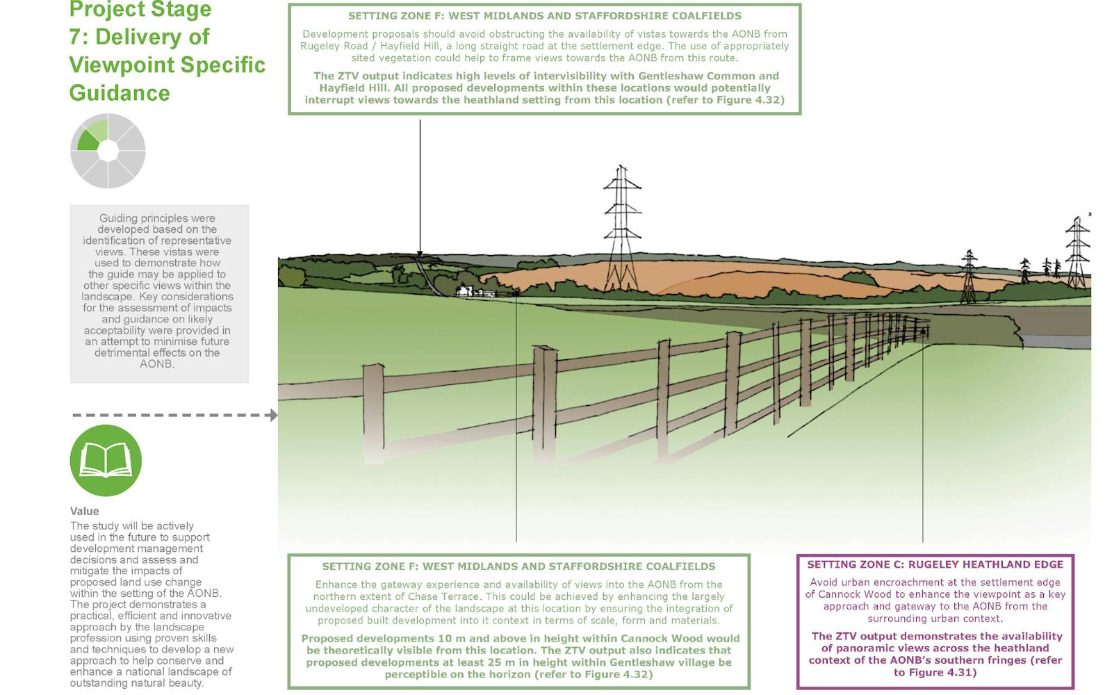 - Casework advice including Expert Witness services to Natural England and the National Trust when a proposal affects the setting of an AONB, National Park or National Trust property;