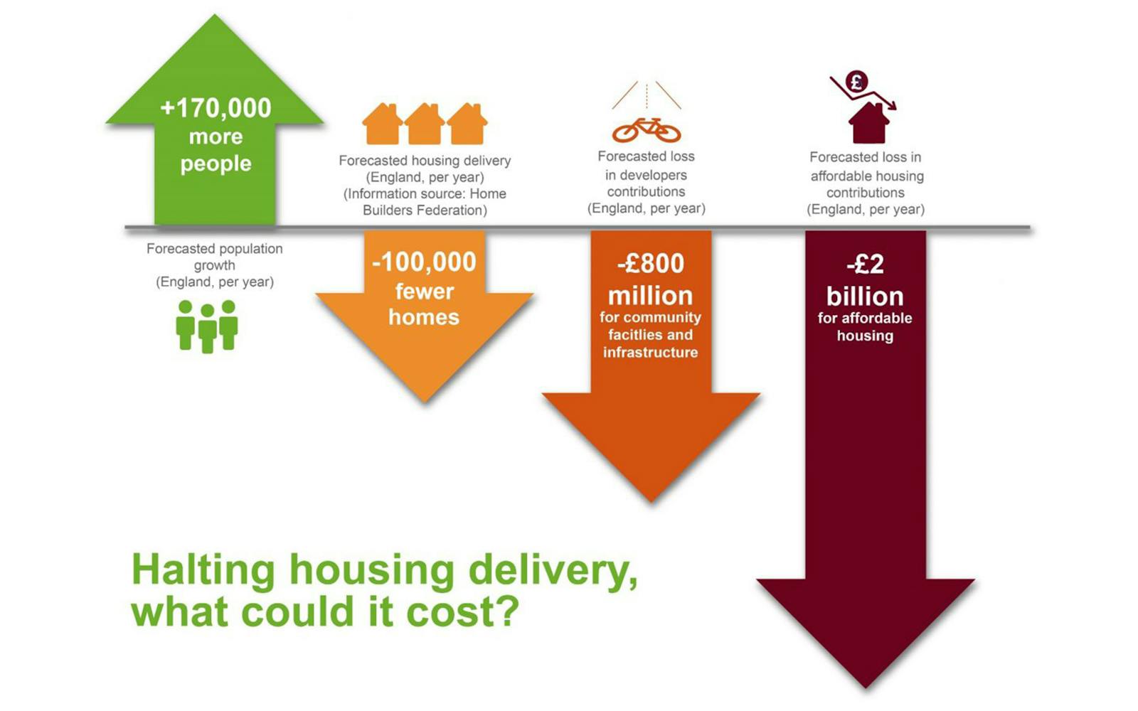 Infrastructure and affordable housing is funded, at least partly, by capturing the land value uplift that occurs as a result of development – through developer contributions. As such, if housing delivery declines, less infrastructure and affordable housing will be provided. These losses should however be considered against a projected ten-year population increase of 1.7 million in England. This will only further exacerbate existing shortfalls.
