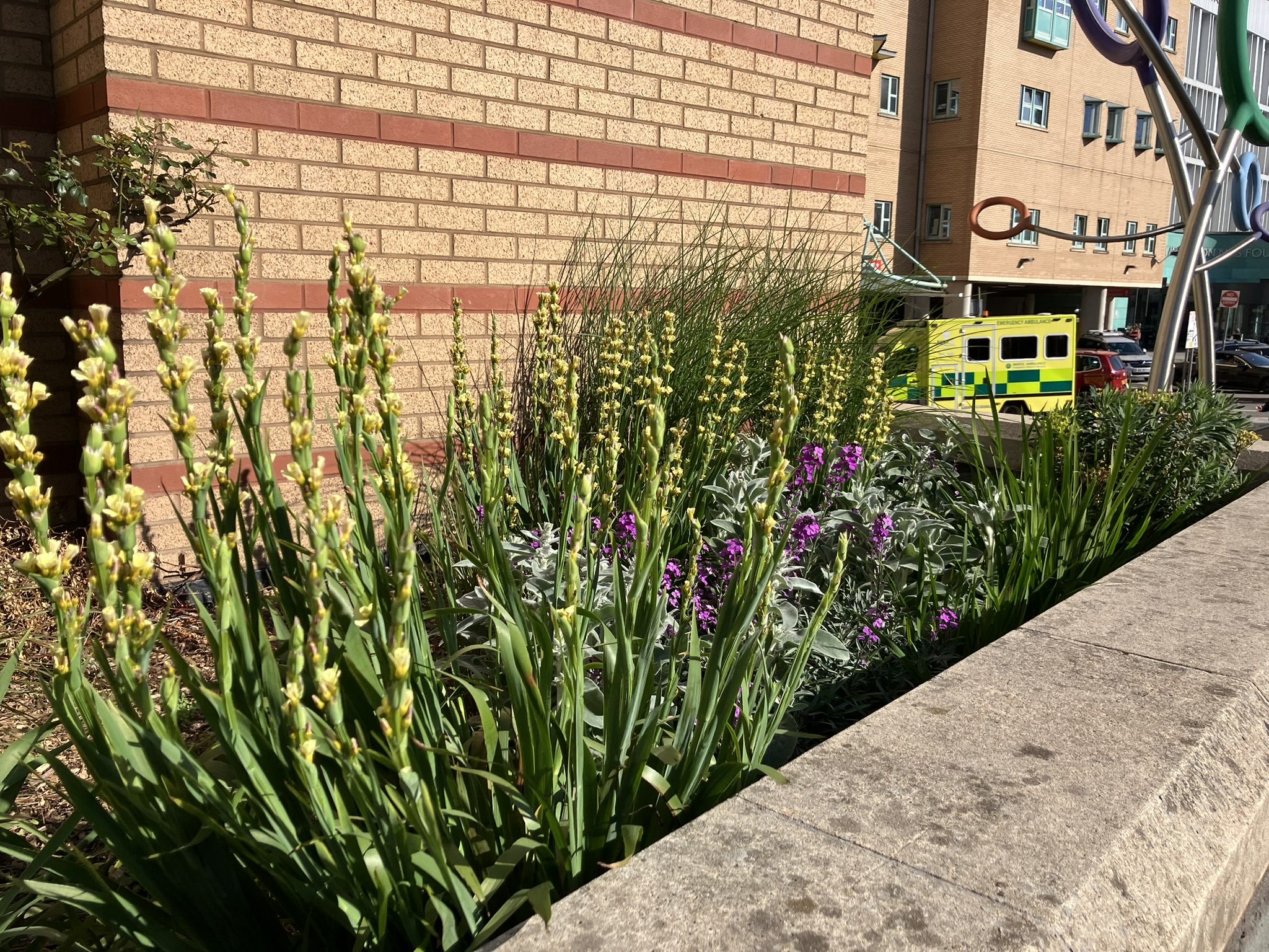 Stachys, Sisyrinchium, Euphorbia, Sesleria, Geranium, and Libertia proved to be standout performers, establishing well despite the site’s exposure and challenging microclimate. Even in the face of litter and cigarette butts, the planting is thriving, filling gaps, softening the hard landscape, and creating a more welcoming space.