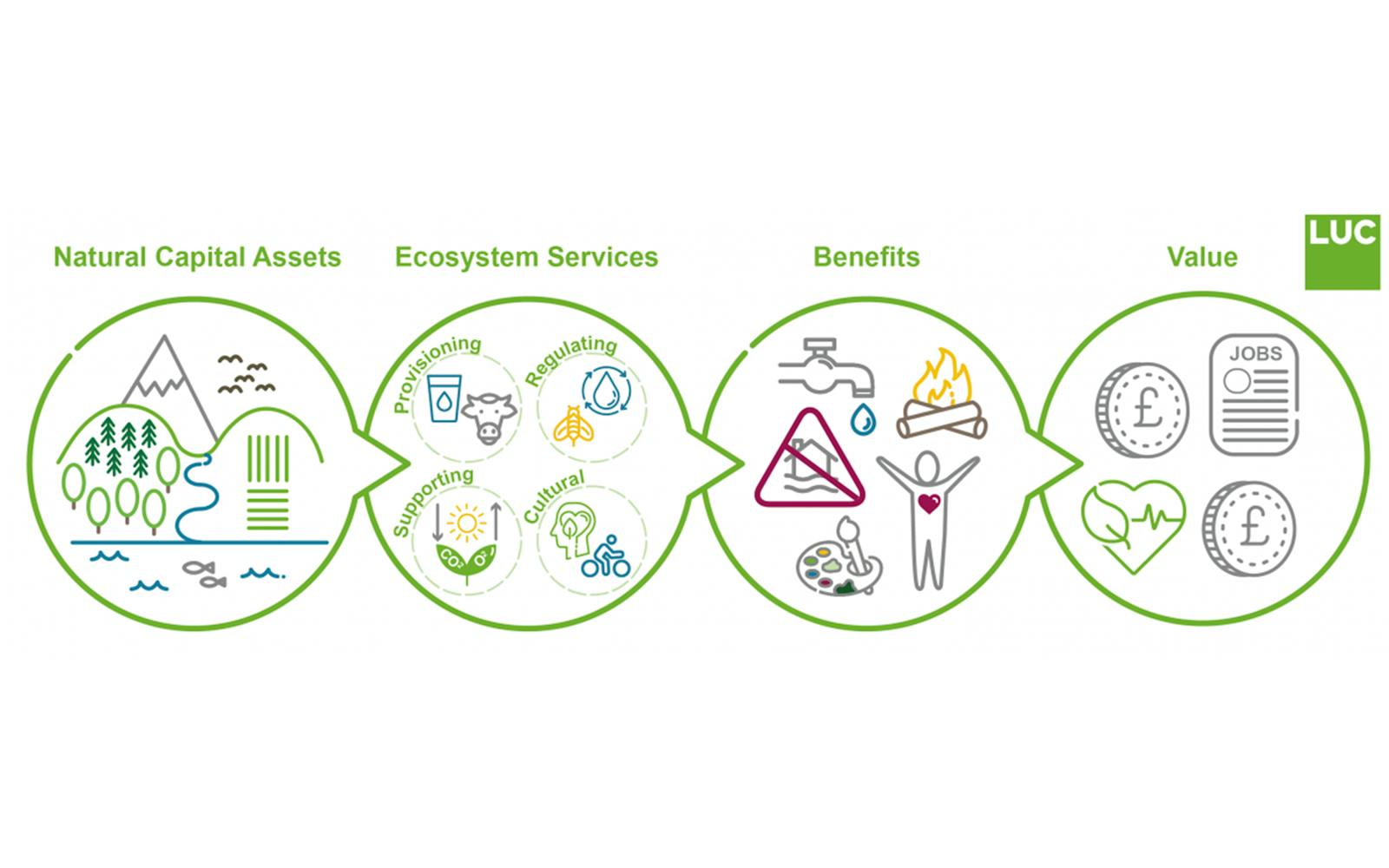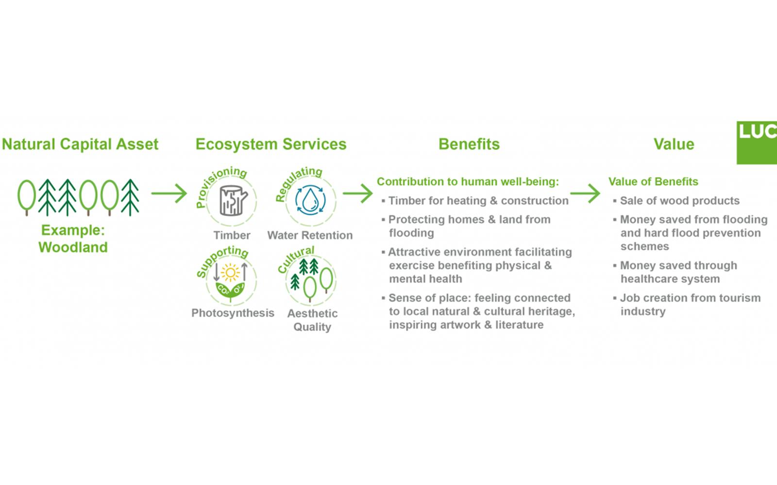 Ecosystem services describe the flow of benefits which we gain from this natural capital. For example, a woodland is a natural capital asset, from which the ecosystem services of supplying wood fuel, reducing water run-off and providing a peaceful retreat can be gained.